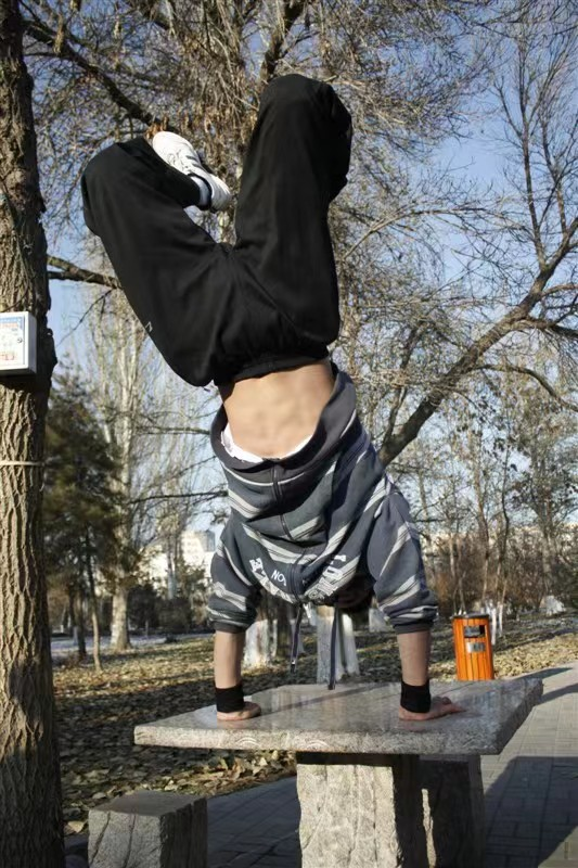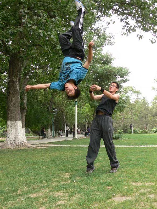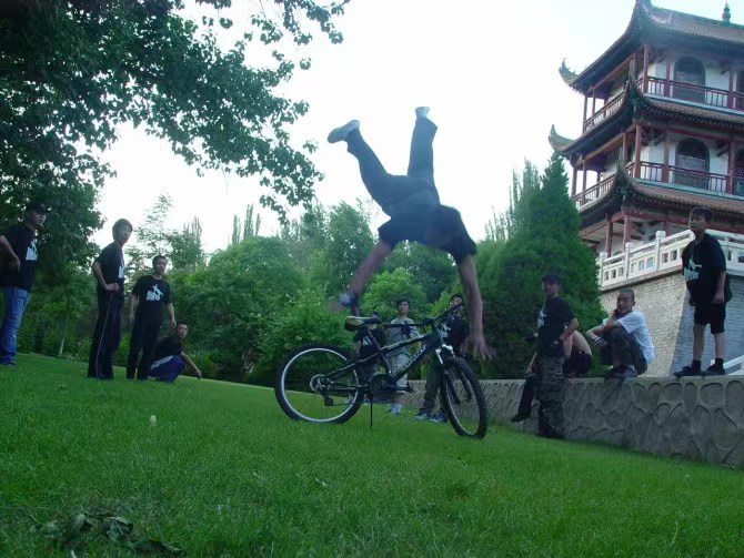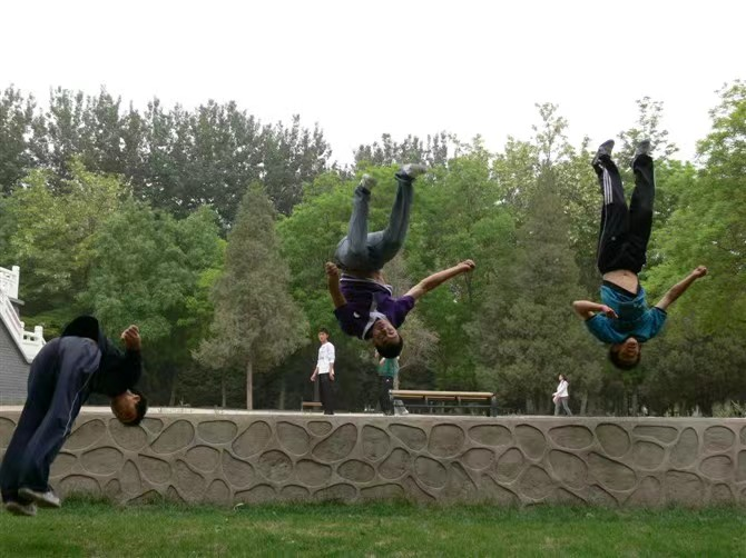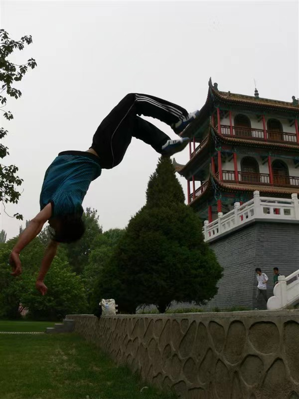 我是老皮(毛伟)2007年10月份左右在陕西铜川工作期间,无意间在网络上发现了跑酷这项运动,立刻就为之热血澎湃。当时就带了一个十几岁的小孩洋洋(已经多年失去联系)自己琢磨着瞎练。同年11月份从陕西铜川回宁夏银川的时候从网络上结识了西安跑酷团队Free Fly当时的负责人,有幸一起训练了一次。但是受伤了,从体育场高台上跪了下来。鞋头开胶张嘴了,猩猩跳(当时的叫法)过杆的时候绊了一下。(训练时有双好鞋太重要了)当时就留下了唯一一张训练照片。