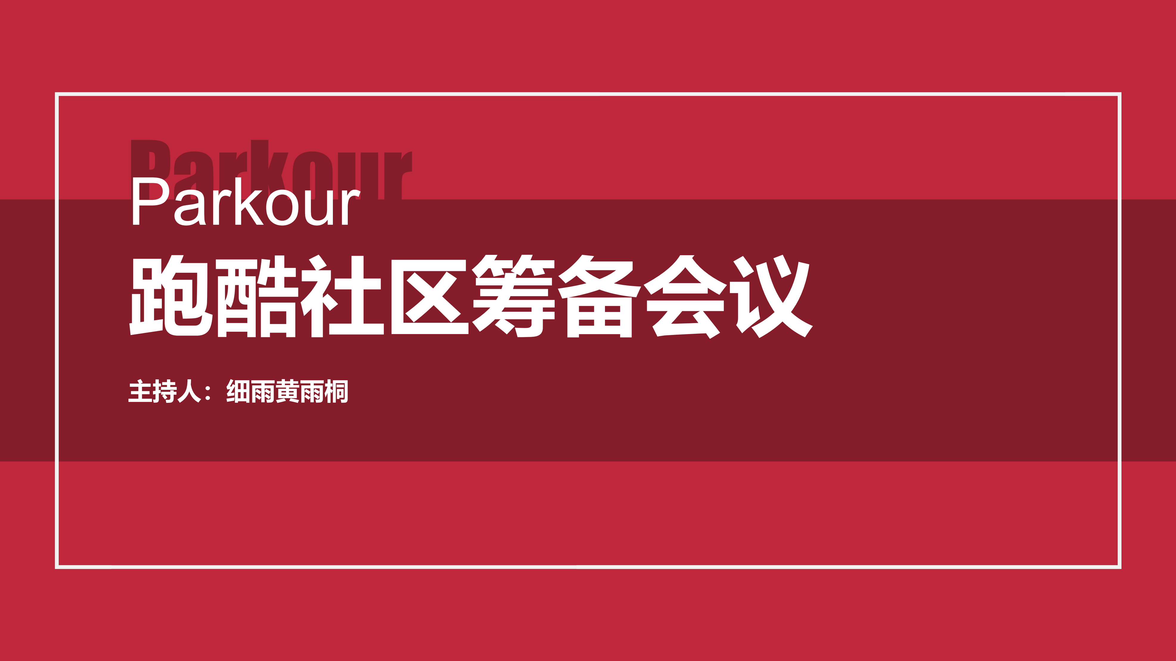 细雨黄雨桐(00:00:00): 大家好,我们现在开始跑酷社区筹备的一个线上会议,我是今天会议的主持人细雨黄雨桐,很荣幸能够主持今天的会议,今天会议的主题就是关于筹备中国跑酷社区的,然后主要目的就是分析我们国内的跑酷发展现状,明确我们这个筹备工作的方向和重心,从而提高我们筹备工作的效率。
