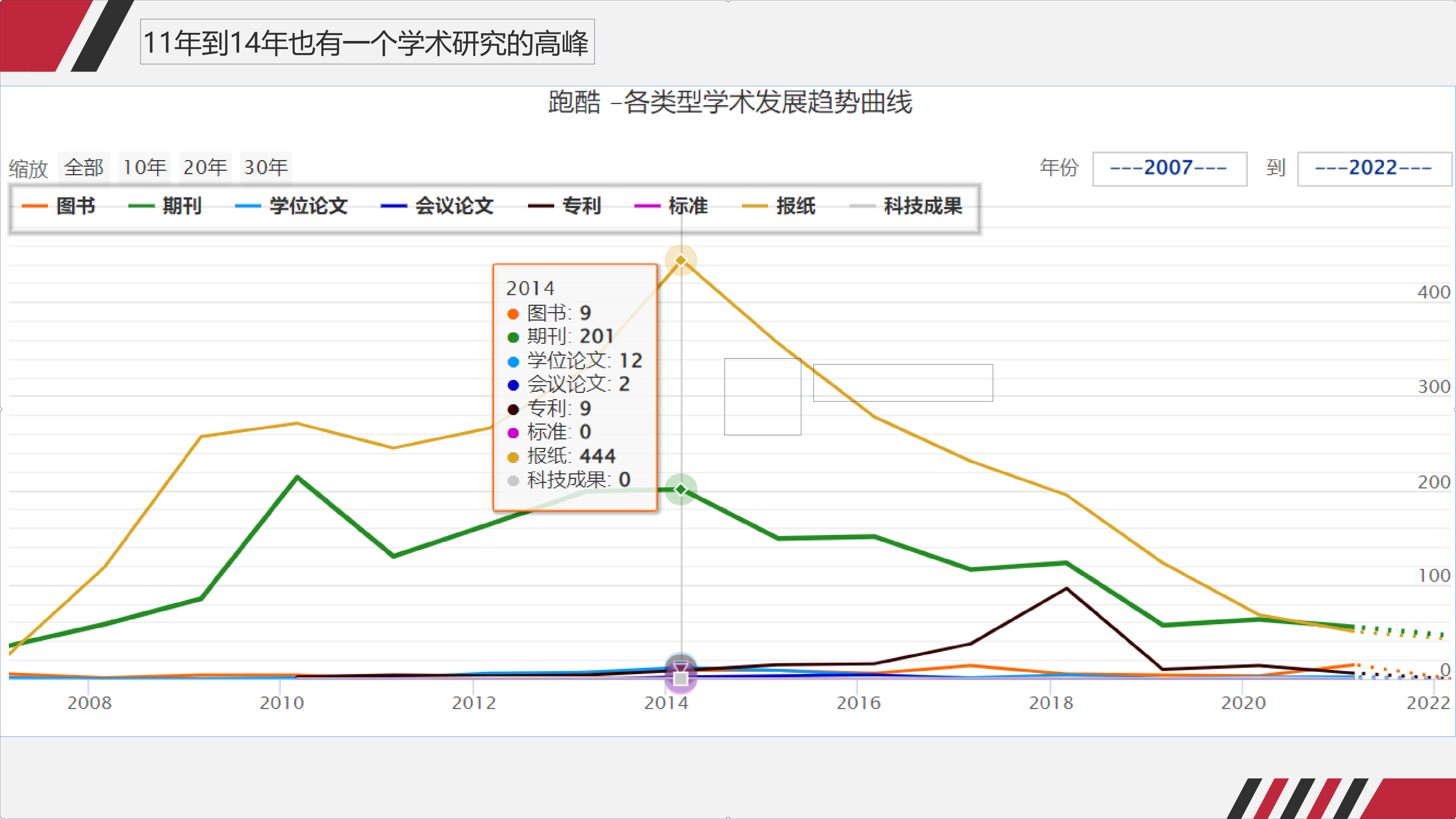 我接下来就要论证一下这一点,就是从我个人的一点浅薄的了解来论证一下为什么跑酷社区非常重要。首先,我们来说一下,就是,这里还要补充一个,就是在14年的时候跑酷相关的学术资料,比如说各种期刊图书报道,他也是在11年到14年的时候,发展到了顶峰之后也是走了下坡路,就是不论是民间还是学界,对跑酷的这个关注都减少了。