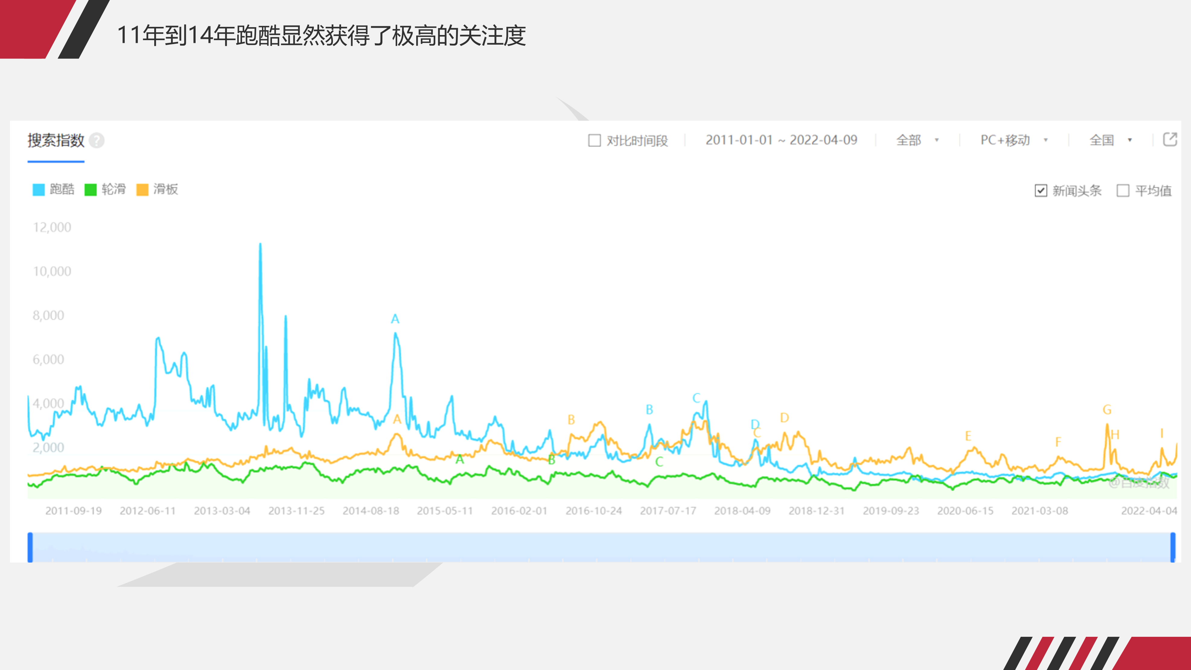 我们根据有一篇研究是说跑酷运动的中国化进程和传播策略的研究,他们说的是我们中国跑酷有三个发展阶段,这个研究是在2013年的时候。在2011年的时候,跑酷就理应进入了一个成长期,它在前面也是经过了我们跑酷最开始的引入期,还有模仿期、规范期,然后第三个阶段就是成长期,也就是在11年应该进入的,也就是百度指数这个最左端的这一个时间,这个时候我们应该进入成长期,成长期的特征,就是说跑酷的代表人物或者说跑酷的团队,他们是以跑酷赛事为载体,来承担这个跑酷运动文化的传播这么一个任务的。