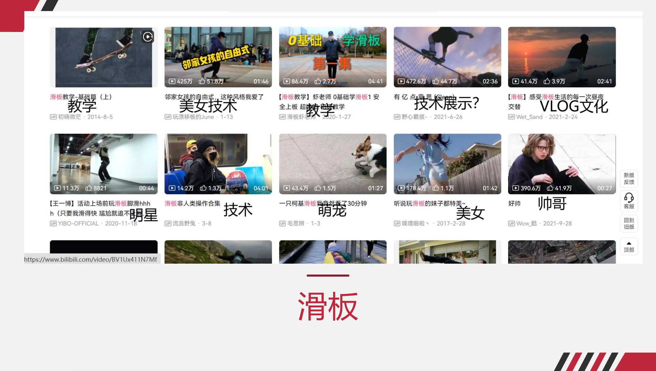 对比一下其他你看比如说我们滑板的,滑板的他都喜欢看生活性的,你看有vlog的,展示的,教学,还有明星的,很贴近他们生活,明星教学技术,还有把宠物搬上来的,就你一看就很贴切生活。轮滑那边也是一样的,有比赛,有教程,宣传片,Vlog,但跑酷显然就完全不是一个画风,跑酷的全都是很夸张,很刺激眼球的一个画风。